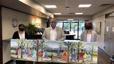 The Abbotsford School District was the recipient, this week, of two art pieces entitled, “Walking Together, Building Connections.” Designed by local artist Linda Klippenstein, this cut-paper project celebrated community diversity and was created by a combined group, 75 women in all, of locally resident Abbotsford women and newcomer women. They gathered over a series of ten informal, inclusion-focused, art-making sessions at The Reach Gallery Museum, Archway Community Services, and W.J.Mouat Secondary.